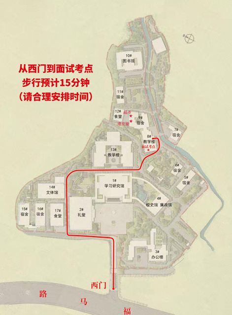 6.考生面试当天可由市委党校西门进入,前往8号楼,具体路线可参考下图: